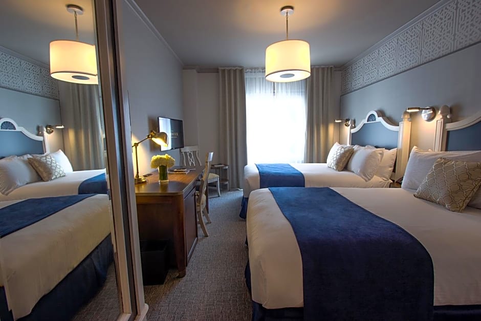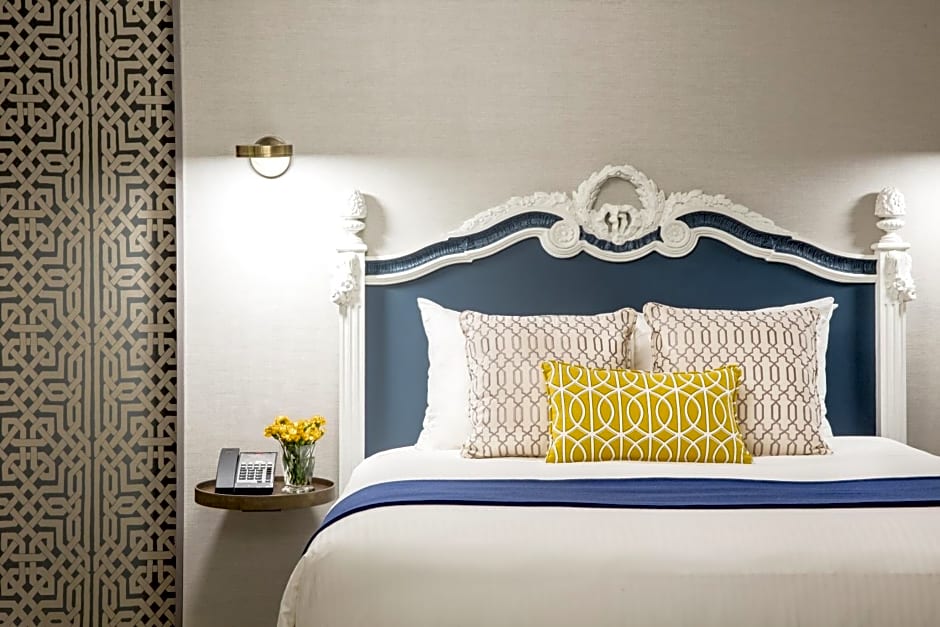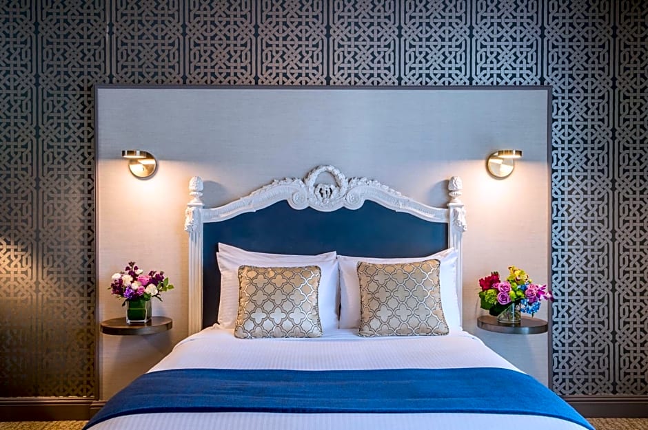 The cozy, intimate ambiance and European flair of this room offer a soothing setting for watching daily life play out on the San Francisco streets below. Appointed with elegant furnishings, rich color palettes and pillowtop beds with plush bedding and fluffy pillows, these rooms are designed for your comfort down to the very last detail. Classic Victorian blue and white décor, blended with modern design elements such as built-in USB ports, a wall-mounted flat-screen TV and compact fridge are featured.